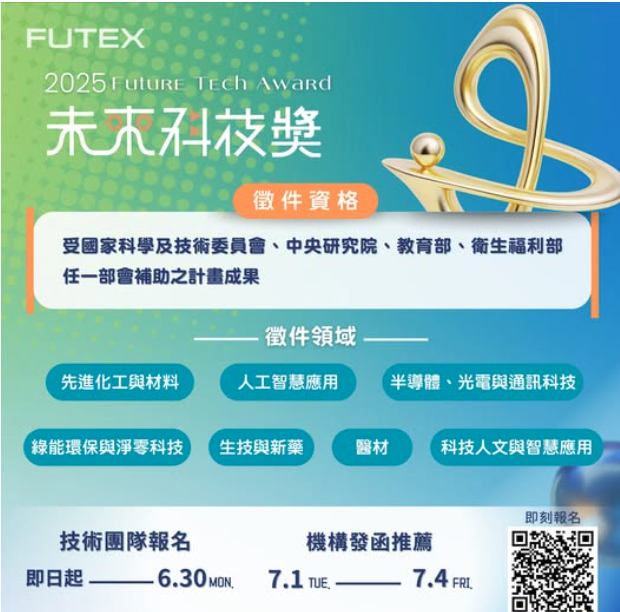 二、獲選獎勵: (一) 得獎技術獲頒「2025 未來科技獎」獎盃 1 座、獎狀 1 張及獎金新臺幣 1 萬元整。